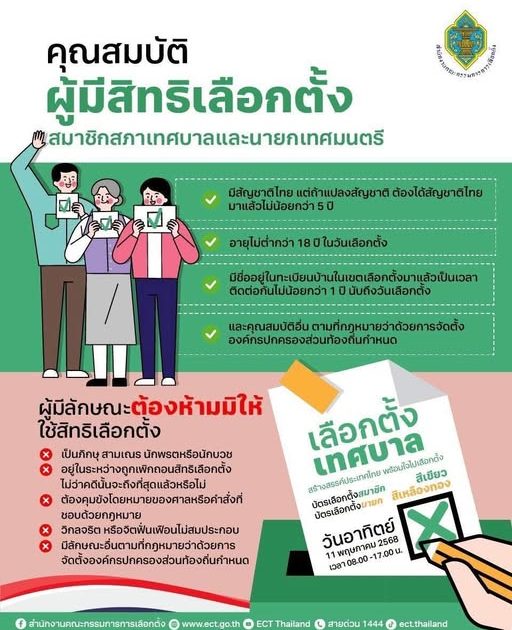 คุณสมบัติของผู้มีสิทธิเลือกตั้งในการเลือกตั้งสมาชิกสภาเทศบาลและนายกเทศมนตรี ในวันอาทิตย์ที่ 11 พฤษภาคม 2568