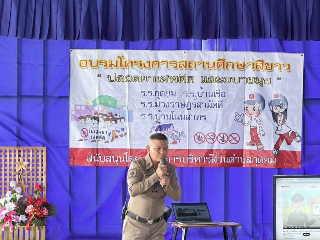 พ.ต.ต.พศิน พิมพ์เมืองเก่า สวป.(ชส.)สภ.ภูเขียว พร้อมด้วย ชุดปฏิบัติการ ชมส.สภ.ภูเขียว และสายตรวจตำบลกุดยม ร่วมเป็นวิทยากรโครงการสถานศึกษาสีขาว “ปลอดยาเสพติด และอบายมุข”