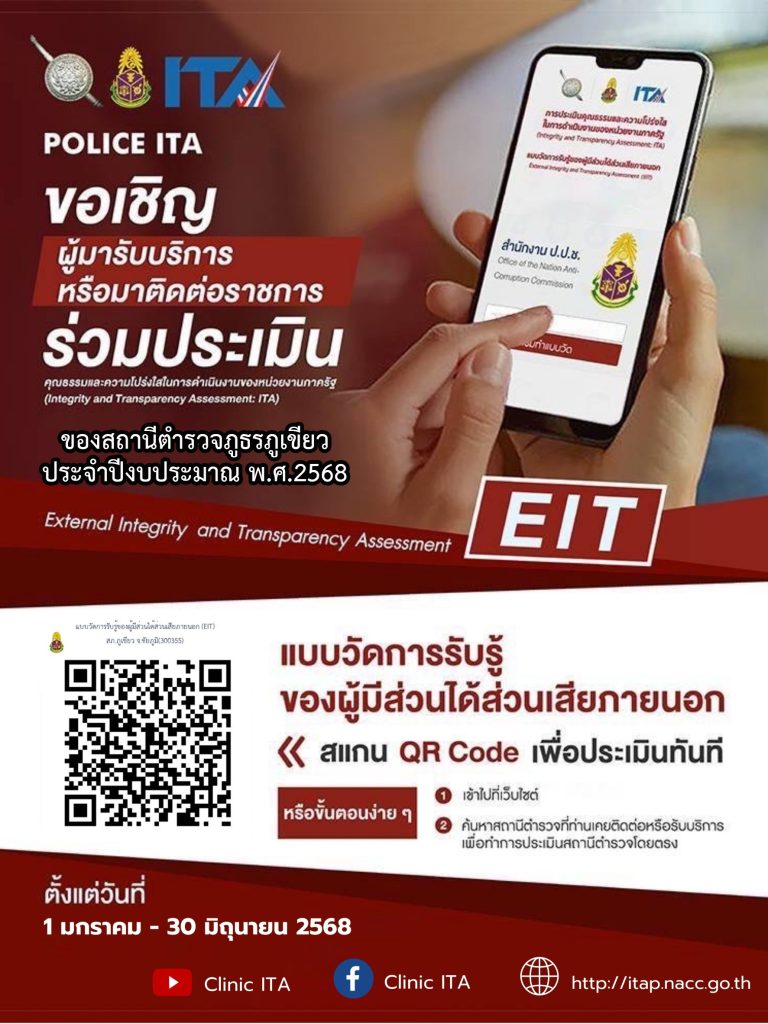 เชิญผู้มารับบริการกับ สภ.ภูเขียว ร่วมประเมินแบบวัดการรับรู้ผู้มีส่วนได้ส่วนเสียภายนอก(EIT) ปี 2568 1 มกราคม 2568 โดย admin / ข่าวประชาสัมพันธ์ https://itap.nacc.go.th/s/F88880247 คลิกที่ลิ้งเพื่อประเมิน FacebookFacebookXTwitterLINELine