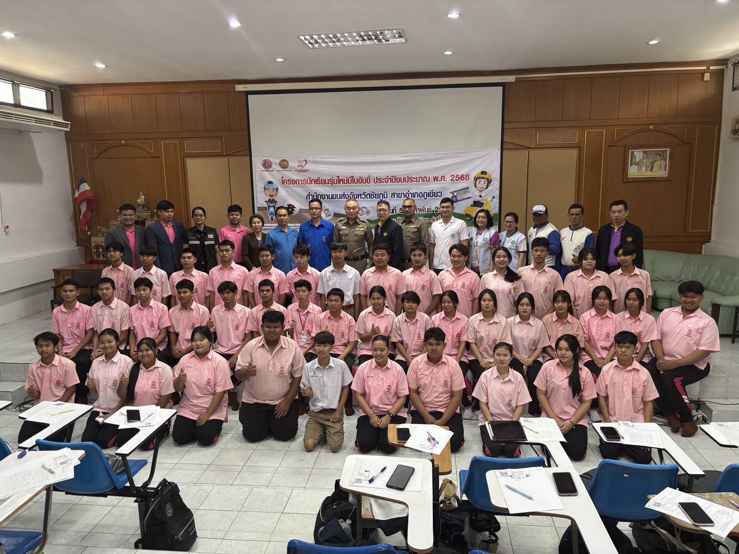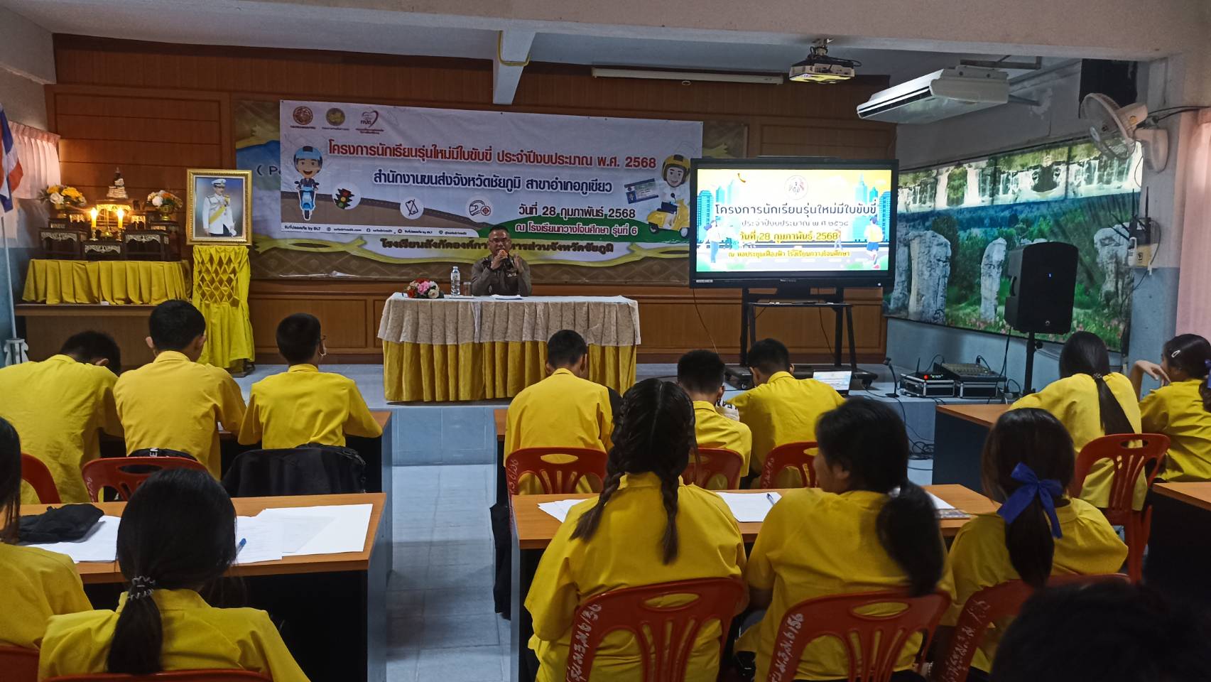 ร.ต.อ.พิเชษฐ์ แสงชาลี รอง. สว.จร.สภ.ภูเขียว ได้เป็นวิทยากรบรรยายให้ความรู้เกี่ยวกับกฏหมายจราจร