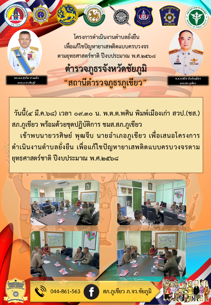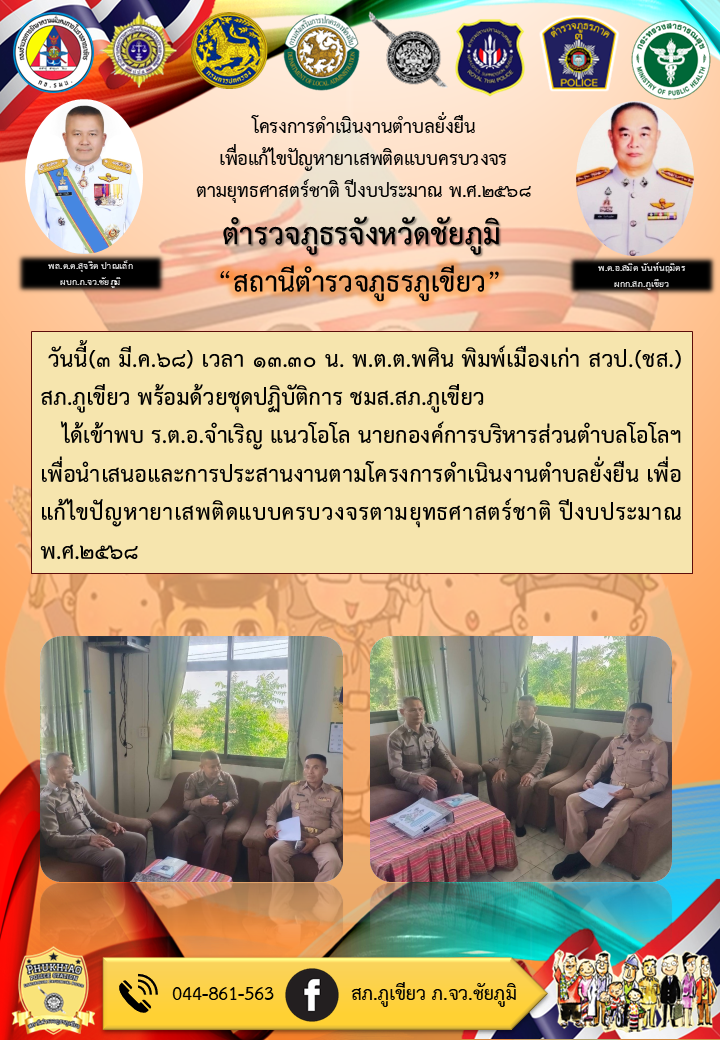 วันที่ 5 มี.ค.68 เวลา 15.45 น. ร.ต.อ.ชัยภัทร ศรีมงคุณ รอง สวป.สภ.ภูเขียว ร้อยเวร 2-0 เรียกแถวสายตรว
